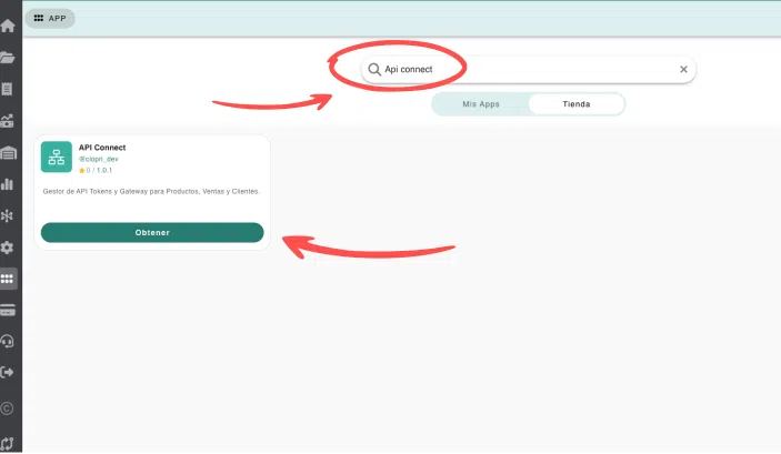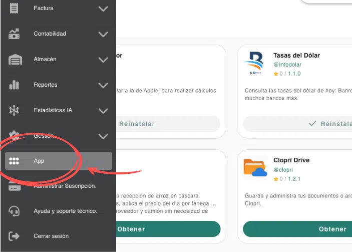 Para instalar la API de Clopri, primero debes dirigirte al apartado “Apps” dentro del menú principal de Clopri.