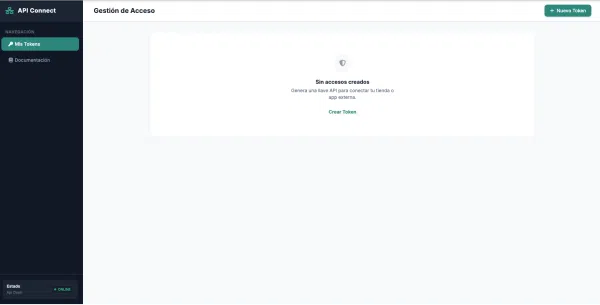 Dentro encontrarás el panel principal, donde podrás crear los tokens de acceso y consultar la documentación de los endpoints disponibles.